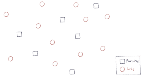 Given a $m$ facilities and $n$ cities. Each facility $i$ has an openning cost $f_i$, and each city $j$ has a connection cost $c_{i,j}$, if $j$ is connnected to facility $i$. The problem is to determine a set of open facilities and to connect all cities, such that the total opening cost plus the total connection cost is minimized.